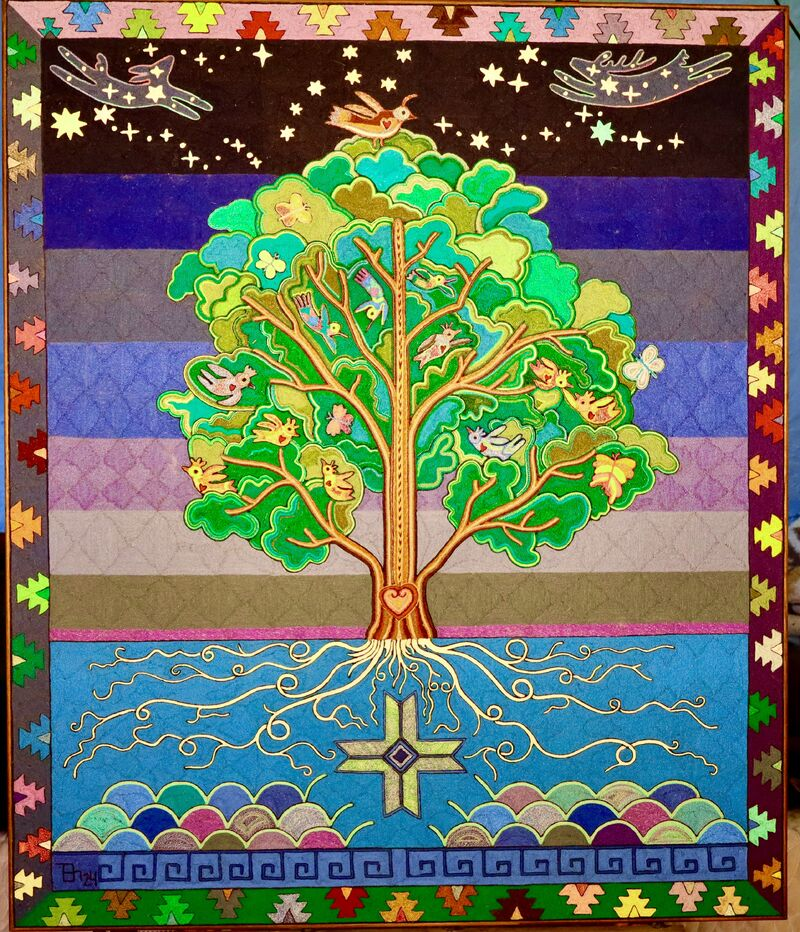 Designed for centuries by the North American Native Huichol people, yarn paintings were originally votive prayer offerings, and have evolved into elaborate works of art depicting sacred stories and symbols.